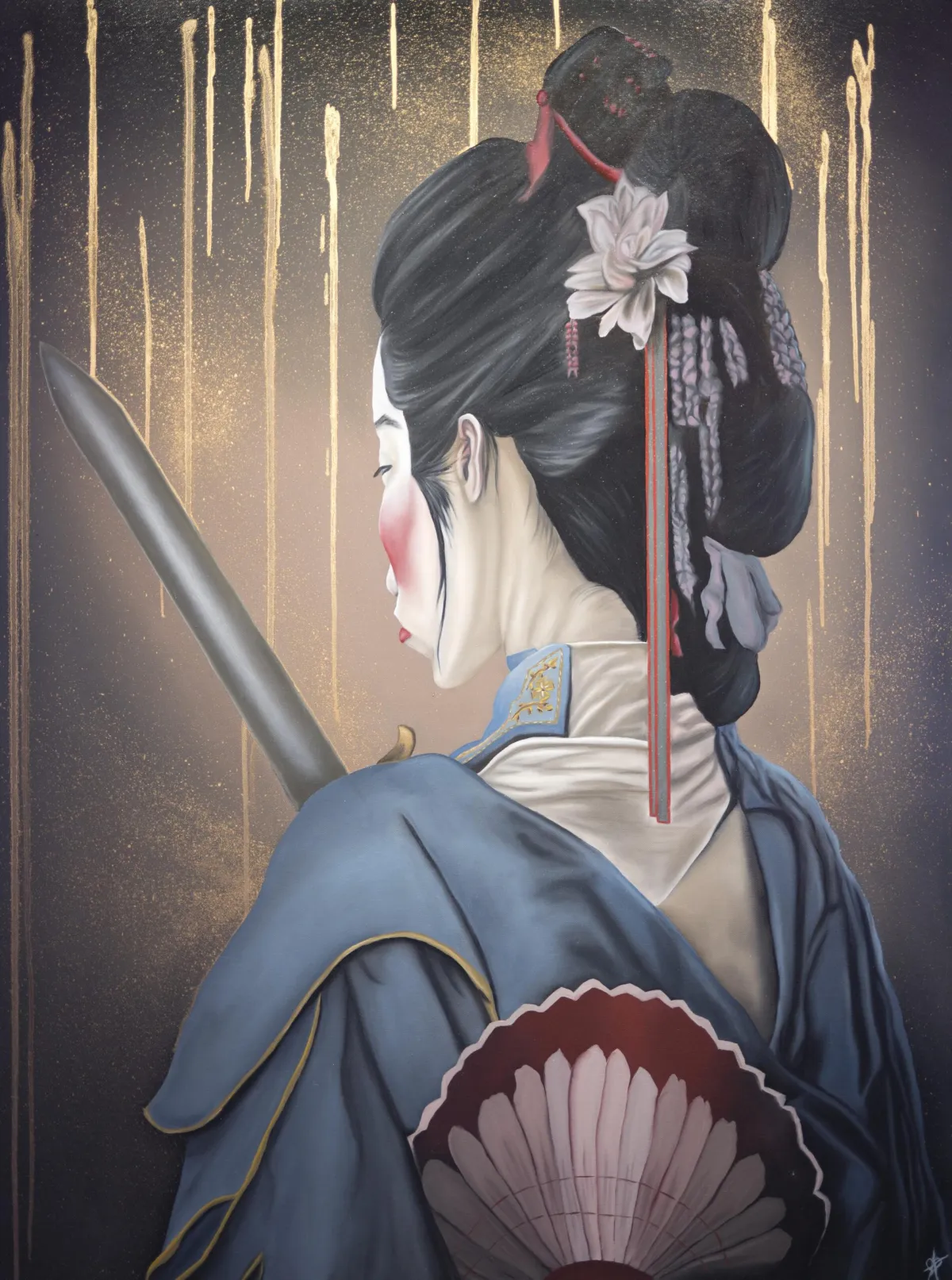 The artist’s preferred medium is oil, and her current style could often be described as Figurative Realism encompassed by action drip techniques and abstract textures and backgrounds. This style, which she fondly calls emotional painting – allows her to explore her innermost emotions in a way that aims to captivate the viewer. She tries to imbue her paintings with a magnetic quality that draws the eye, and she is not afraid to take risks when it comes to her art. Each painting represents an emotional relationship with her canvas that has been months in the making.